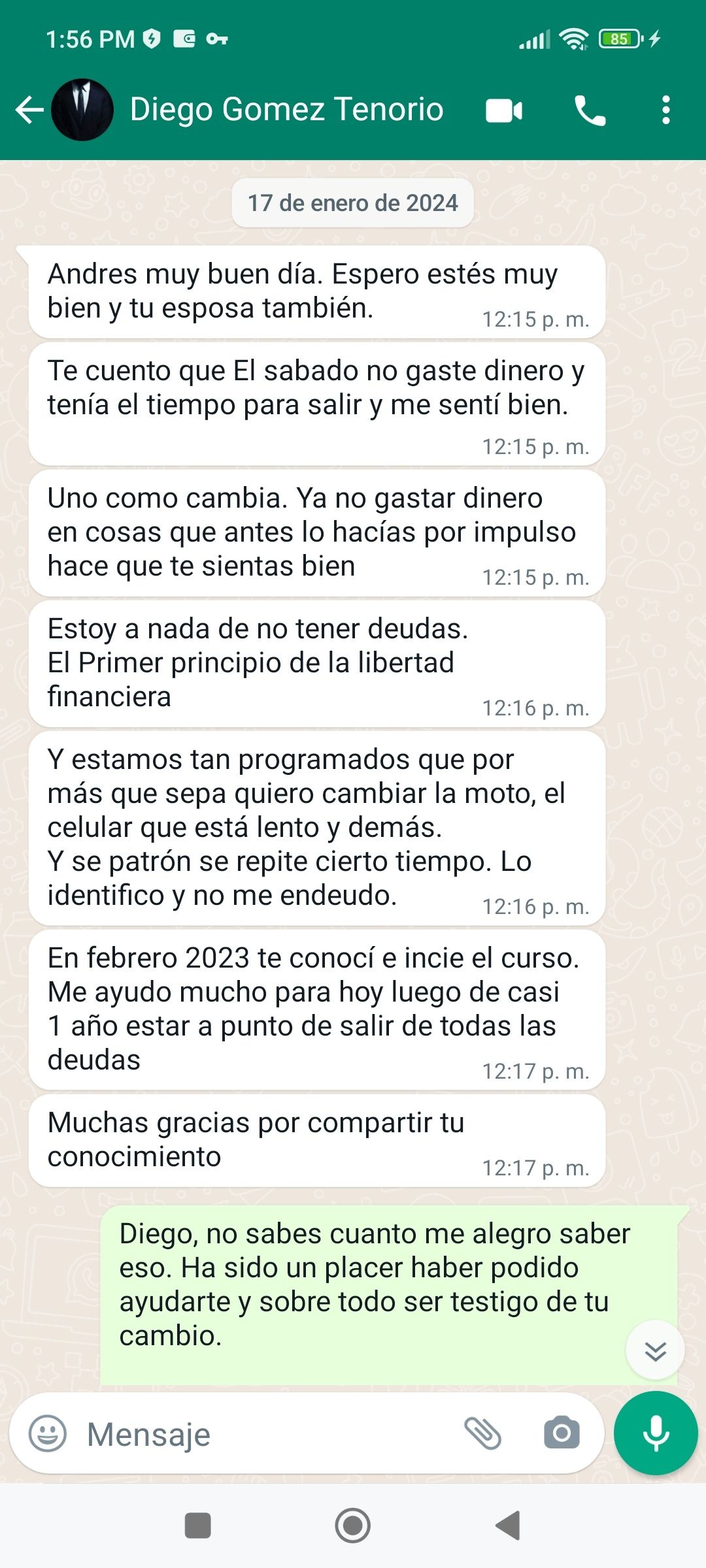 «Este libro me ha enseñado a tener una vida financiera más saludable y una vida personal más plena. Me mostró cómo organizar mis finanzas, cómo reducir mis gastos, cómo generar más ingresos. Pero también y creo que fue lo más valioso, me mostró cómo conocerme mejor, cómo identificar mis pasiones y talentos, cómo crear hábitos positivos y dejar de ser una víctima de la vida. Gracias a este libro, si pude mandar mi empleo al carajo y increible fue que al poco tiempo conseguí otro donde si me siento bien. El libro es un todo en uno indispensable»